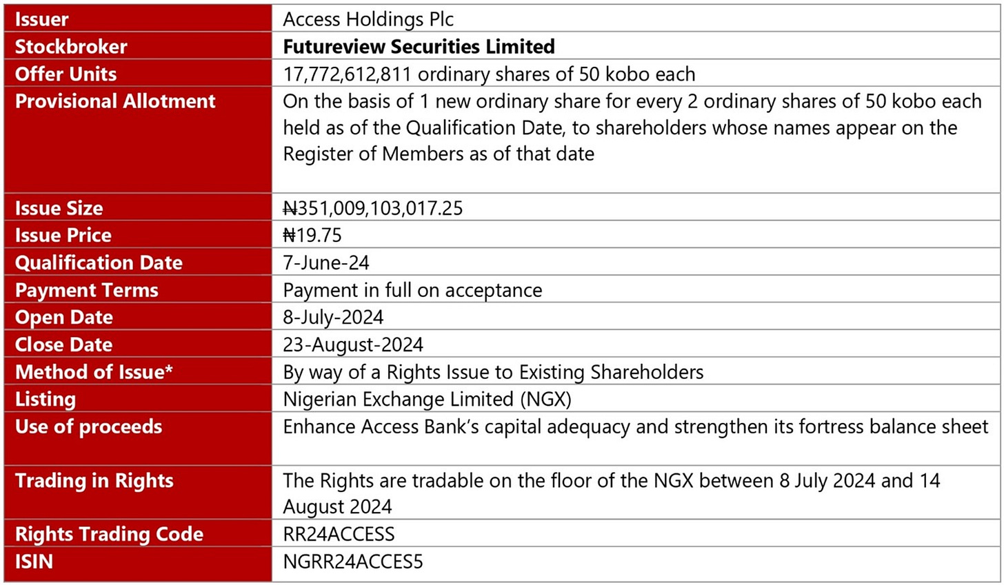 Futureview Financial Services Limited is pleased to inform you that Access Holdings PLC (“Access Holdings” or “Access Corporation” or “the Corporation”) Rights Issue of 17,772,612,811 ordinary shares at 50 kobo each, priced at N19.75 per share, (Application/Acceptance Period) has been extended and will now close on Friday, 23rd of August 2024.