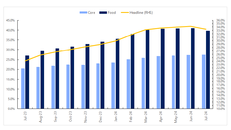 In July 2024, the headline inflation rate decreased to 33.40% from 34.19% in June 2024, marking a 0.8% point drop. However, on a year-on-year basis, inflation was 9.32% points higher compared to July 2023’s rate of 24.08%. Month-on-month, inflation in July 2024 was 2.28%, slightly lower than June 2024’s 2.31%, indicating a slower increase in the average price level.