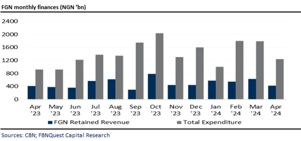 - Cumulatively, the FGN’s retained revenue and expenditure amounted to about N2.0trn and N4.9trn over the 4M period to April 2024, implying a fiscal deficit of roughly N3.0trn.