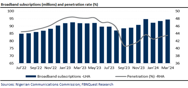 Nigerian Communications Commission data shows broadband trends over the past two years, with broadband penetration peaking at 48.5% in Feb ’23, dropping to 40.8% in September 2023, and rising subsequently. Despite a 2.5% y/y increase in subscriptions to 94.2 million in March 2024, penetration fell by 468 bps to 43.5%. Unlike the 2021 decline driven by the NIN-SIM integration exercise, the recent drop is due to the regulator’s adoption of a higher population base of 217 million compared to 191 million used until August 2023.