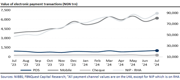 - For instance, the total value of transactions through the mobile channel rose by 10% MoM and 63% YoY to N6.2trn in July 2024.