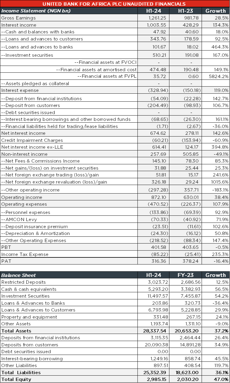 UBA recorded a 119.0% y/y growth in interest expense to NGN328.94 billion due to the higher cost incurred on deposits from customers (+106.7% y/y to NGN204.49 billion), borrowings (+161.1% y/y to NGN68.65 billion) and deposits from financial institutions (+142.7% y/y to NGN54.09 billion). We attribute the higher expense incurred on deposits from customers to the increase in the bank’s deposits (+33.7% YTD to NGN23.21 trillion) despite a slight improvement in the group’s CASA mix (H1-24: 87.5% vs Q1-24: 87.0%). Consequent to the faster growth in interest income than interest expenses, the group recorded a 142.6% y/y expansion in net interest income to NGN674.62 billion. Eventually, net interest income ex-LLE closed higher at NGN614.41 billion (+394.8% y/y) after factoring the 60.9% y/y decline in the group’s impairment charges in H1-24.