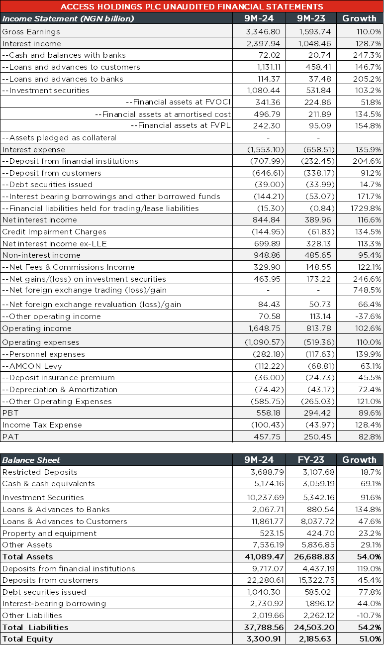 Access Holdings Plc (ACCESSCORP) published their 9M-24 unaudited financial statements at the close of business yesterday (30 October), reporting a 79.2% y/y increase in EPS to NGN12.40 (9M-23: NGN6.92). The expansion in earnings was driven by gains across the group’s funded (+128.7% y/y) and non-funded income (+95.4% y/y) lines. Remarkably, ACCESSCORP surpassed NGN3.00 trillion in gross earnings in the period under review, becoming the first bank to achieve such a feat.