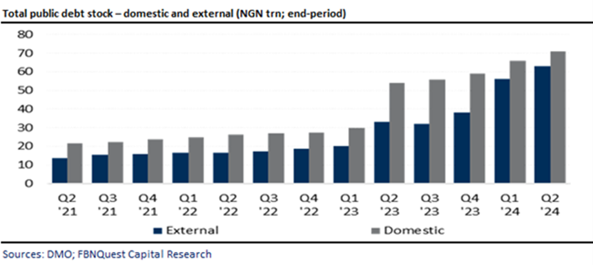 The most recent update from the Debt Management Office (DMO) on Nigeria’s debt stock shows that the nation’s debt burden increased by N12.6trn, or (+10% q/q), to N134.3trn (US$91.3bn) as at end-June 2024. Two factors contributed to the modest rise. The first is the depreciation of the naira, which added about N5.9trn to the total debt stock. For context, the exchange rate used to convert dollar-denominated debt to naira was N1,470.2/USD compared with N1,330.3/USD in Q1 2024. An additional contributing factor is fresh borrowings from the domestic market.