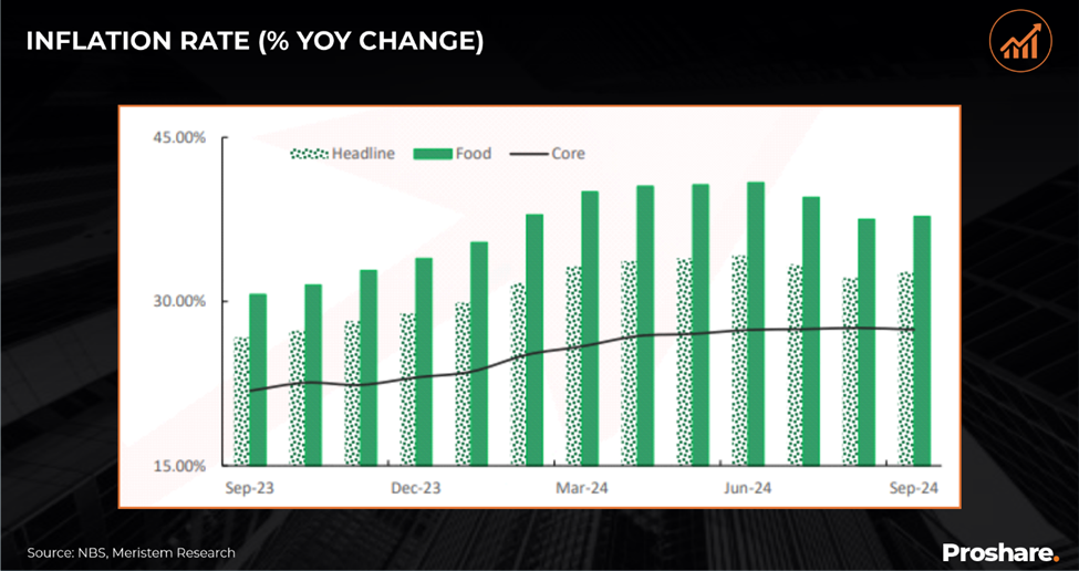 Headline inflation reversed its decline in September 2024, climbing to 32.70% from 32.15% in August after two months of disinflation. As of September 2024, food inflation rose to 37.77%, while core inflation stood at 27.43%.