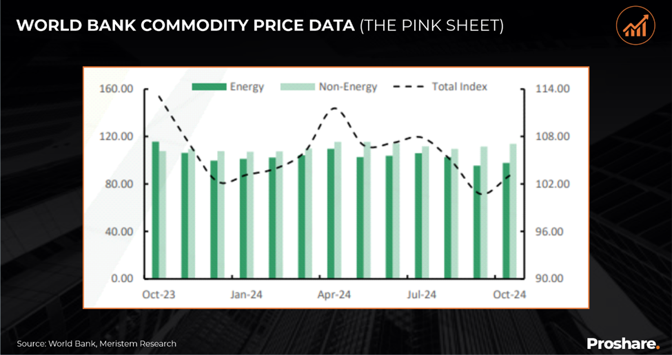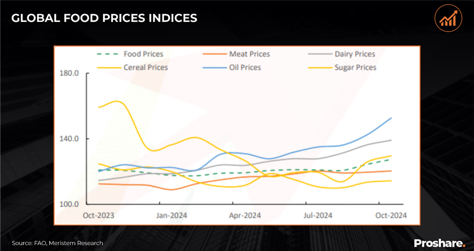 The rise in food prices is reflected in the Food and Agriculture Organization (FAO) Food Price Index (FFPI), which reached an 18-month high of 127.35 points in October 2024, a 1.98% increase from 124.39 points in September 2024. This increase was primarily driven by gains in the vegetable oil index (+7.27%), sugar index (+2.62%), dairy index (+1.87%), and cereals index (+0.79%). Likewise, the World Bank Commodity Index rose by 2.31%, supported by increases in the Energy Index (+2.44%) and the Non-energy Index (+2.08%).