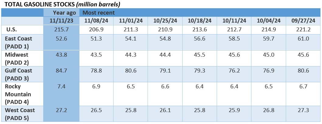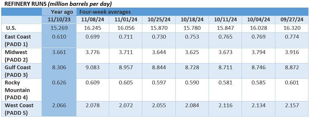 Surging Ethanol Output in U.S. Lifts Stocks. US ethanol production rose to an all-time high in the week ended 8 November, reaching 1.11 million b/d and marking a 6.3% year-over-year increase, as the current oversupply boosted U.S. inventories that jumped to 22 million barrels, with a particularly robust jump in U.S. Gulf stocks.