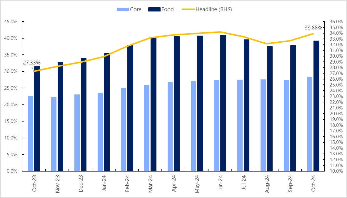 In October 2024, the headline inflation rate rose to 33.88%, up from 32.70% in September 2024, reflecting an increase of 1.18 percentage points. Year-on-year, the inflation rate was 6.55 percentage points higher than the 27.33% recorded in October 2023, indicating a significant rise compared to the same period last year.