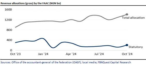 The most recent communique released by the Federation Account Allocation Committee (FAAC) shows that the federation’s revenue disbursements to the three tiers of government amounted to about N1.4trn (US$835m) in October 2024 (from September 2024 revenue). November’s gross distribution represents an increase of +8.7% month-on-month (MoM) or N113bn relative to the previous month’s payout. Excluding the electronic money transfer levy, which declined by -5% MoM to N17.1bn, all other revenue segments recorded m/m increases during the month.