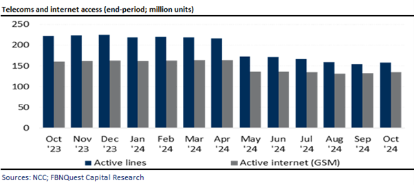 According to the most recent data from the Nigerian Communication Commission (NCC), active mobile lines increased modestly by 2% month-on-month (MoM) to 157.6 million in October 2024. The growth in October ended the monthly drop in mobile line subscriptions that started in March 2024 due to the NIN-SIM linkage exercise imposed by the sector regulator. As a result, all unlinked SIM cards were disabled, significantly reducing active mobile lines. Similarly, internet connections grew slightly by c.1% m/m to 134.2 million.