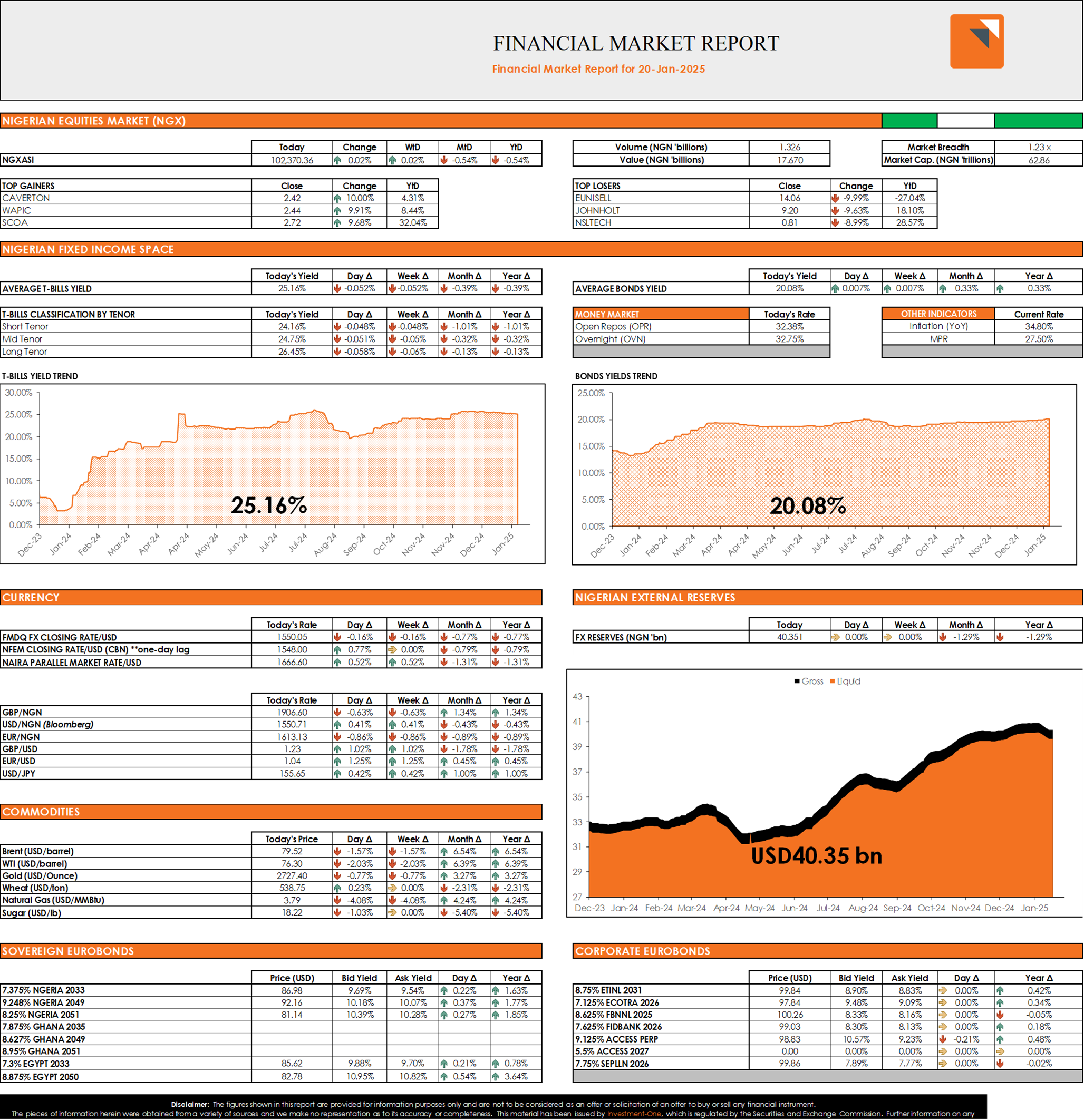 In the fixed income space, the Treasury Bills secondary market traded on a bullish note on the back of the buying interest noticed across the curve. Consequently, Average T-Bills yield declined by 5bps to close at 25.16%. However, the FGN Bond market traded on a negative note as the Average FGN Bond yield inched up by 1bp to close at 20.08%.