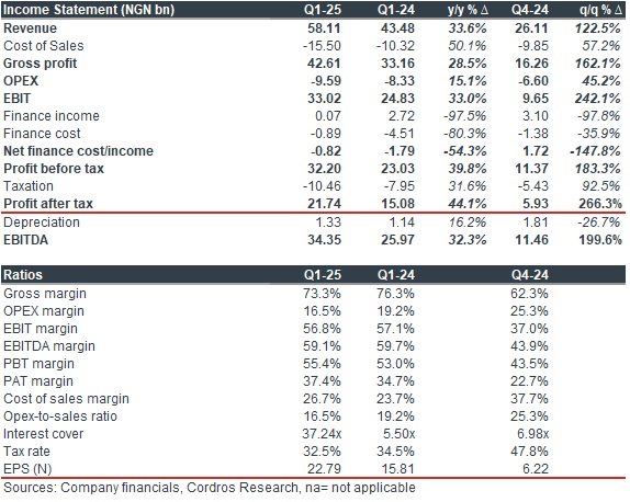 Overall, the company recorded a PBT growth of 39.8% y/y to NGN32.20 billion in Q1-25 (Q1-24: NGN23.03 billion). Following a tax expense of NGN10.46 billion, profit after tax grew by 44.1% y/y to NGN21.74 billion (Q1-24: NGN15.08 billion).