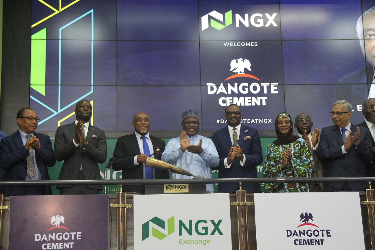 L – R shows Group Head, Corporate Communications, Dangote Group, Tony Chiejina; Group Managing Director/CEO, Nigerian Exchange Group (NGX Group), Temi Popoola; Chairman, Dangote Cement Plc, Emmanuel Ikhazoboh; Group Chairman, NGX Group, Alhaji (Dr.) Umaru Kwairanga; Chief Executive Officer, Nigerian Exchange Limited (NGX), Jude Chiemeka; Director, Dangote Cement Plc, Mariya Dangote; Head Primary Markets, NGX, Tony Ibeziako and GMD, Dangote Cement Plc, Arvind Pathak during the Closing Gong Ceremony and Facts Behind the Figures Presentation at NGX Group yesterday in Lagos. Image Credit: Dangote Group