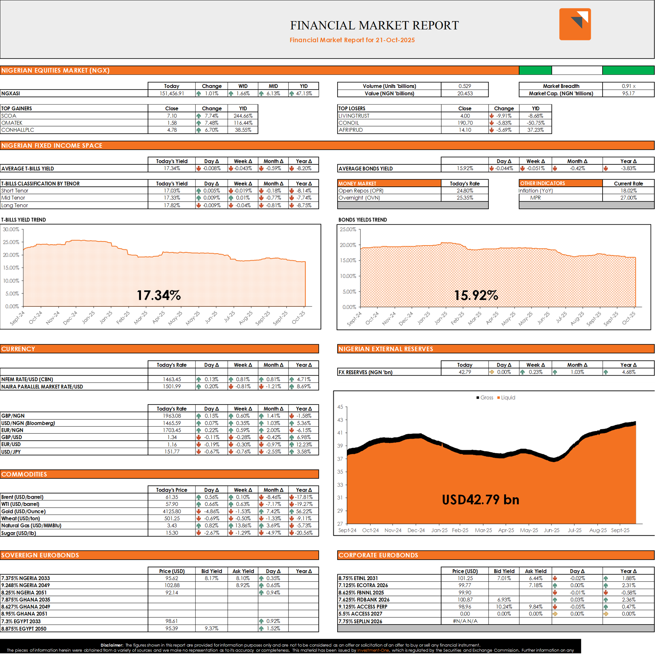In the fixed income space, the Treasury Bills secondary market traded on a slightly positive note, following the decline in yields observed across the long tenor of the benchmark curve. Consequently, the Average T-Bills yield declined by 1bps to close at 17.34%. Similarly, the FGN Bond secondary market also traded on a positive tone as the Average FGN Bond yield declined by 4bps to close at 15.92%.