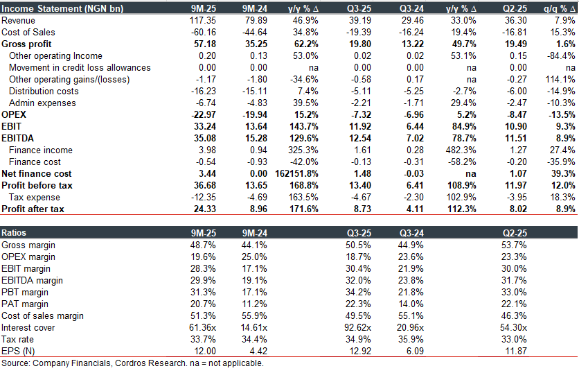 NASCON Allied Industries Plc (NASCON) published its Q3-25 unaudited financials on Thursday (30 October), reporting earnings per share (EPS) of NGN12.92 (+112.2% y/y), bringing 9M-25 EPS to NGN12.00 (+171.5% y/y). The performance was driven by a blend of strong revenue growth (+33.0% y/y) and improved cost efficiency, reflected in a 495bps y/y contraction in OPEX margin.