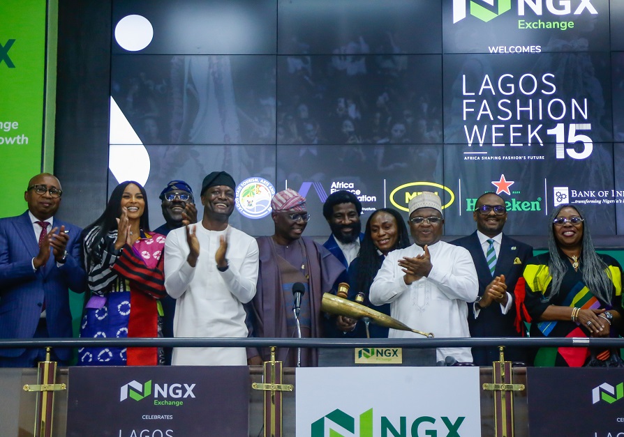 L – R shows Haruna Jalo-Waziri, Managing Director/CEO, Central Securities Clearing System (CSCS); Ciara Wilson, American Singer & Fashion Model; Mr. Abayomi Oluyomi, Honorable Commissioner for Finance, Lagos State; Mr. Temi Popoola, Group Managing Director/CEO, Nigerian Exchange Group; His Excellency, Mr. Babajide Sanwo-Olu, Executive Governor of Lagos State; Mr. Tokunbo Akerele, Chairman, Lagos Fashion Week/Style House Files; Mrs Omoyemi Akerele, Founder/CEO, Lagos Fashion Week/Style House Files; Alhaji (Dr.) Umaru Kwairanga, Chairman, NGX Group; Mr. Jude Chiemeka, CEO, NGX and Mrs. Toke-Benson Awoyinka, Honorable Commissioner for Tourism, Arts & Culture, Lagos State, during the Closing Gong Ceremony in commemoration of Lagos Fashion Week at the Exchange today in Lagos. Image Credit: NGX