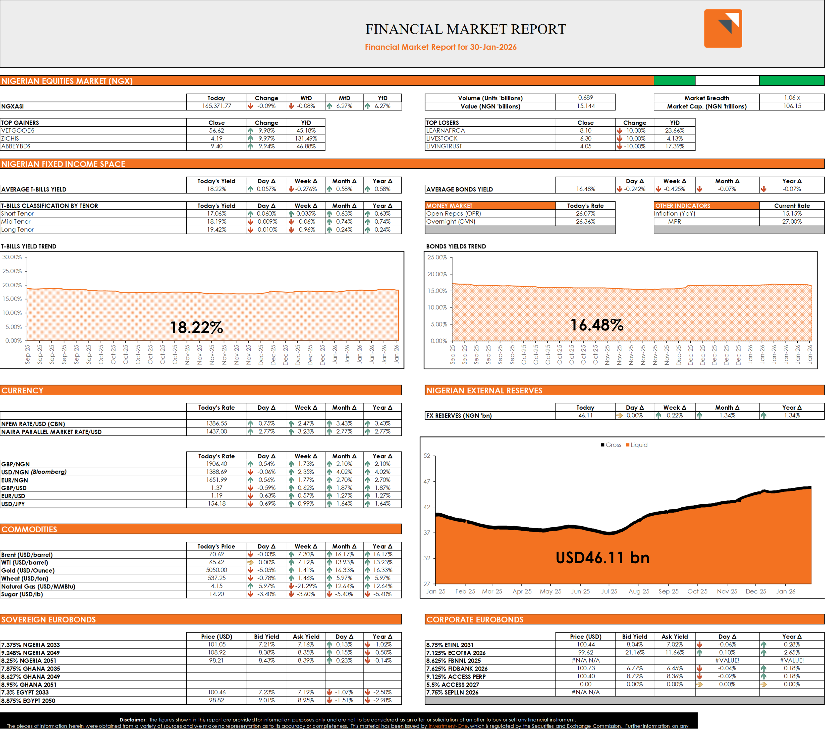 In the fixed income space, the Treasury Bills secondary market traded on a bearish note due to sell pressure seen across the short end of the benchmark curve. Consequently, the Average T-Bills yield increased by 6bps to close at 18.22%. Meanwhile, the FGN Bond secondary market traded on a bullish note as the Average FGN Bond yield fell by 24bps to close at 16.48%.