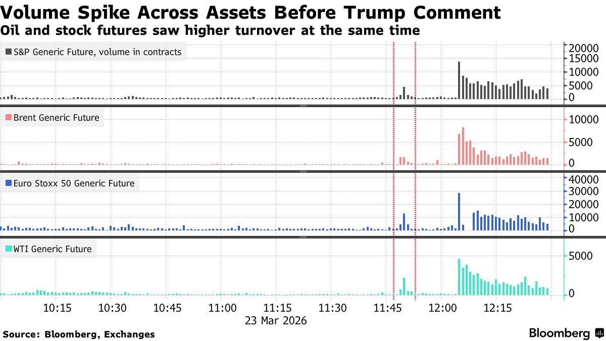 – According to Bloomberg, contracts worth at least 6 million barrels of Brent and WTI were sold in the two minutes before Trump’s Iran post, almost tenfold the usual trading volume in oil futures.