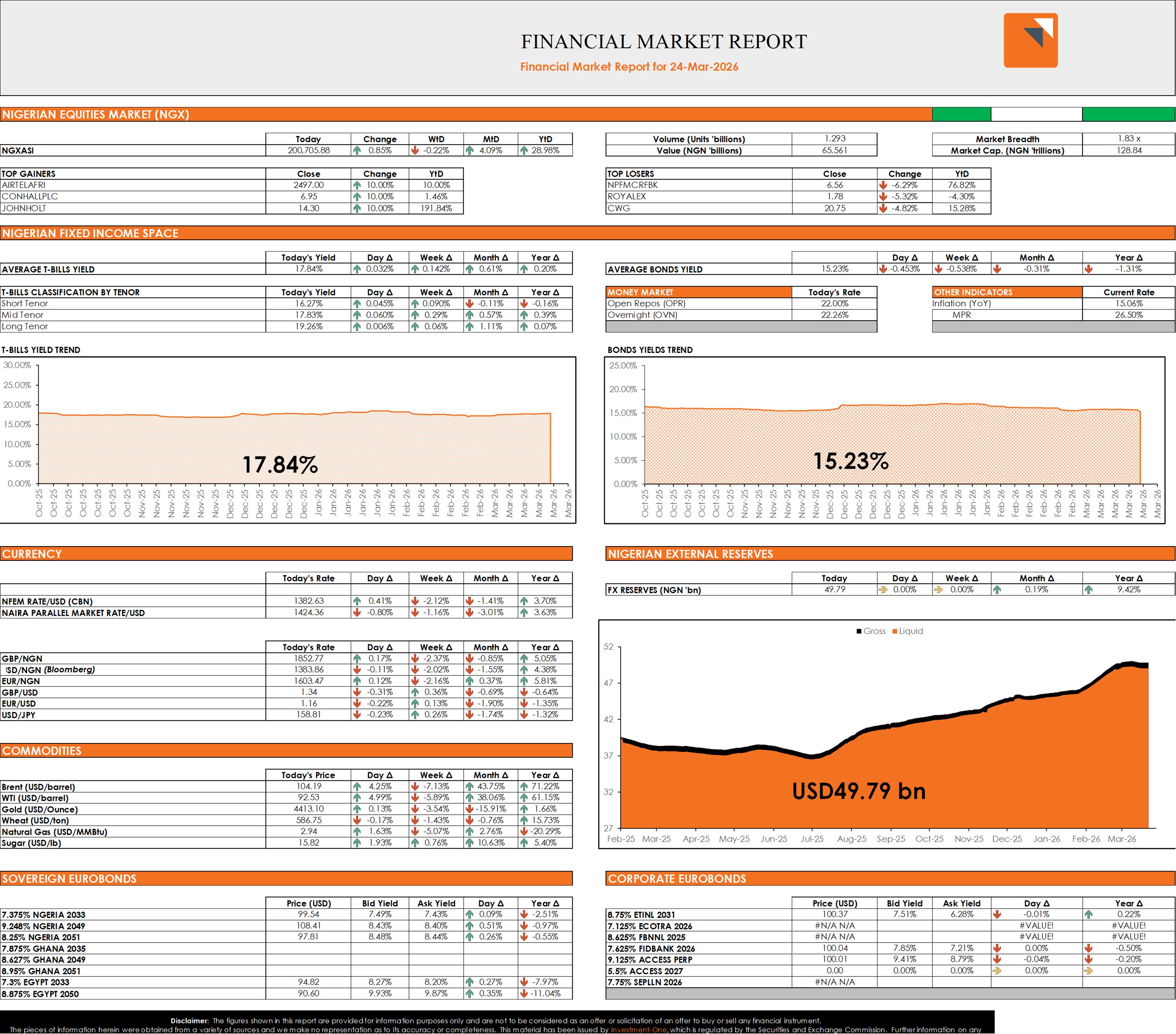 In the fixed income space, the Treasury Bills secondary market traded on a bearish note, due to selloffs seen across the benchmark curve. As a result, the Average T-Bills yield rose by 3bps to close at 17.84%. However, the FGN Bond secondary market traded on a positive note as the Average FGN Bond yield fell by 45bps to close at 15.23%.